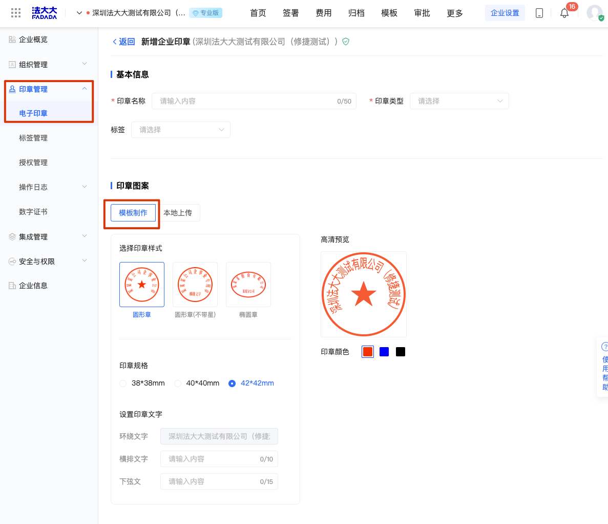企业可通过法大大在线生成具有法律效力的电子印章。只要法大大官网注册并按系统指引完成认证,在法大大官网的右上角的「企业设置」,进入「印章管理」模块,点击「电子印章」,按需选择印章类型、字体、图案、颜色、规格等元素进行个性化定制,即可在线生成电子印章。