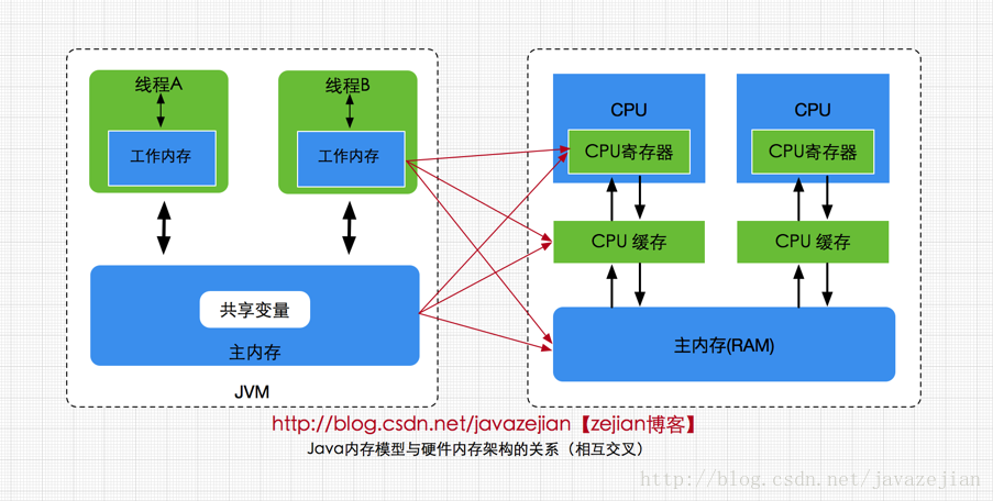 通过对前面的硬件内存架构、Java内存模型以及Java多线程的实现原理的了解,我们应该已经意识到,多线程的执行最终都会映射到硬件处理器上进行执行,但Java内存模型和硬件内存架构并不完全一致。对于硬件内存来说只有寄存器、缓存内存、主内存的概念,并没有工作内存(线程私有数据区域)和主内存(堆内存)之分,也就是说Java内存模型对内存的划分对硬件内存并没有任何影响,因为JMM只是一种抽象的概念,是一组规则,并不实际存在,不管是工作内存的数据还是主内存的数据,对于计算机硬件来说都会存储在计算机主内存中,当然也有可能存储到CPU缓存或者寄存器中,因此总体上来说,Java内存模型和计算机硬件内存架构是一个相互交叉的关系,是一种抽象概念划分与真实物理硬件的交叉。(注意对于Java内存区域划分也是同样的道理)