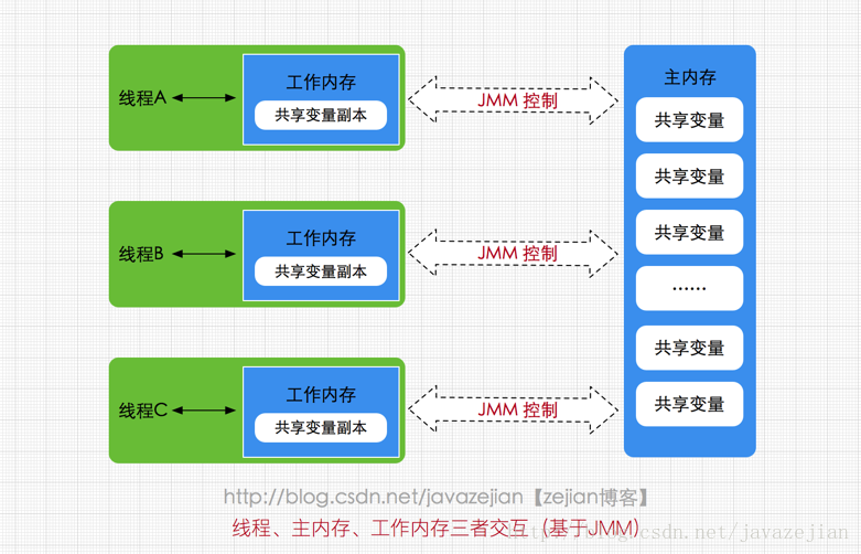 Java内存模型(即Java Memory Model,简称JMM)本身是一种抽象的概念,并不真实存在,它描述的是一组规则或规范,通过这组规范定义了程序中各个变量(包括实例字段,静态字段和构成数组对象的元素)的访问方式。由于JVM运行程序的实体是线程,而每个线程创建时JVM都会为其创建一个工作内存(有些地方称为栈空间),用于存储线程私有的数据,而Java内存模型中规定所有变量都存储在主内存,主内存是共享内存区域,所有线程都可以访问,但线程对变量的操作(读取赋值等)必须在工作内存中进行,首先要将变量从主内存拷贝的自己的工作内存空间,然后对变量进行操作,操作完成后再将变量写回主内存,不能直接操作主内存中的变量,工作内存中存储着主内存中的变量副本拷贝,前面说过,工作内存是每个线程的私有数据区域,因此不同的线程间无法访问对方的工作内存,线程间的通信(传值)必须通过主内存来完成,其简要访问过程如下图