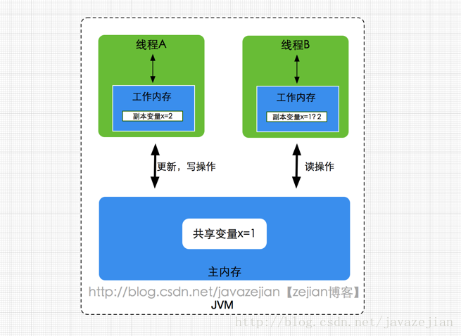 在明白了Java内存区域划分、硬件内存架构、Java多线程的实现原理与Java内存模型的具体关系后,接着来谈谈Java内存模型存在的必要性。由于JVM运行程序的实体是线程,而每个线程创建时JVM都会为其创建一个工作内存(有些地方称为栈空间),用于存储线程私有的数据,线程与主内存中的变量操作必须通过工作内存间接完成,主要过程是将变量从主内存拷贝的每个线程各自的工作内存空间,然后对变量进行操作,操作完成后再将变量写回主内存,如果存在两个线程同时对一个主内存中的实例对象的变量进行操作就有可能诱发线程安全问题。如下图,主内存中存在一个共享变量x,现在有A和B两条线程分别对该变量x=1进行操作,A/B线程各自的工作内存中存在共享变量副本x。假设现在A线程想要修改x的值为2,而B线程却想要读取x的值,那么B线程读取到的值是A线程更新后的值2还是更新前的值1呢?答案是,不确定,即B线程有可能读取到A线程更新前的值1,也有可能读取到A线程更新后的值2,这是因为工作内存是每个线程私有的数据区域,而线程A变量x时,首先是将变量从主内存拷贝到A线程的工作内存中,然后对变量进行操作,操作完成后再将变量x写回主内,而对于B线程的也是类似的,这样就有可能造成主内存与工作内存间数据存在一致性问题,假如A线程修改完后正在将数据写回主内存,而B线程此时正在读取主内存,即将x=1拷贝到自己的工作内存中,这样B线程读取到的值就是x=1,但如果A线程已将x=2写回主内存后,B线程才开始读取的话,那么此时B线程读取到的就是x=2,但到底是哪种情况先发生呢?这是不确定的,这也就是所谓的线程安全问题。