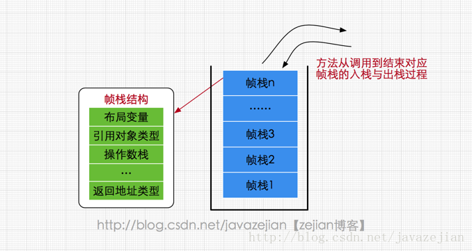 属于线程私有的数据区域,与线程同时创建,总数与线程关联,代表Java方法执行的内存模型。每个方法执行时都会创建一个栈桢来存储方法的的变量表、操作数栈、动态链接方法、返回值、返回地址等信息。每个方法从调用直结束就对于一个栈桢在虚拟机栈中的入栈和出栈过程,如下(图有误,应该为栈桢):