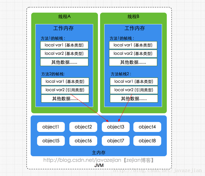 弄清楚主内存和工作内存后,接了解一下主内存与工作内存的数据存储类型以及操作方式,根据虚拟机规范,对于一个实例对象中的成员方法而言,如果方法中包含本地变量是基本数据类型(boolean,byte,short,char,int,long,float,double),将直接存储在工作内存的帧栈结构中,但倘若本地变量是引用类型,那么该变量的引用会存储在功能内存的帧栈中,而对象实例将存储在主内存(共享数据区域,堆)中。但对于实例对象的成员变量,不管它是基本数据类型或者包装类型(Integer、Double等)还是引用类型,都会被存储到堆区。至于static变量以及类本身相关信息将会存储在主内存中。需要注意的是,在主内存中的实例对象可以被多线程共享,倘若两个线程同时调用了同一个对象的同一个方法,那么两条线程会将要操作的数据拷贝一份到自己的工作内存中,执行完成操作后才刷新到主内存,简单示意图如下所示: