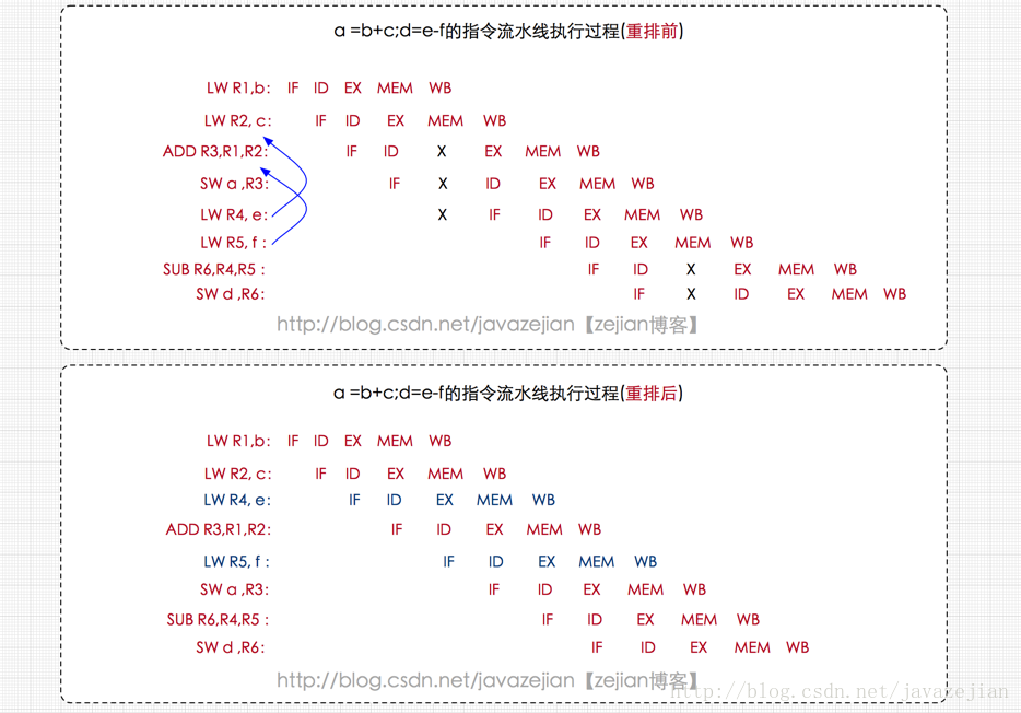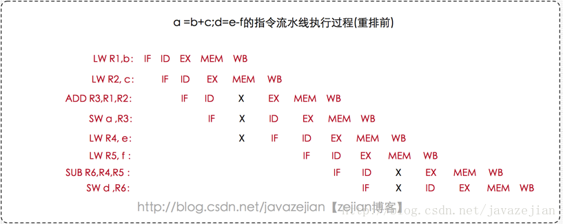上述便是汇编指令的执行过程,在某些指令上存在X的标志,X代表中断的含义,也就是只要有X的地方就会导致指令流水线技术停顿,同时也会影响后续指令的执行,可能需要经过1个或几个指令周期才可能恢复正常,那为什么停顿呢?这是因为部分数据还没准备好,如执行ADD指令时,需要使用到前面指令的数据R1,R2,而此时R2的MEM操作没有完成,即未拷贝到存储器中,这样加法计算就无法进行,必须等到MEM操作完成后才能执行,也就因此而停顿了,其他指令也是类似的情况。前面阐述过,停顿会造成CPU性能下降,因此我们应该想办法消除这些停顿,这时就需要使用到指令重排了,如下图,既然ADD指令需要等待,那我们就利用等待的时间做些别的事情,如把LW R4,e 和 LW R5,f 移动到前面执行,毕竟LW R4,e 和 LW R5,f执行并没有数据依赖关系,对他们有数据依赖关系的SUB R6,R5,R4指令在R4,R5加载完成后才执行的,没有影响,过程如下: