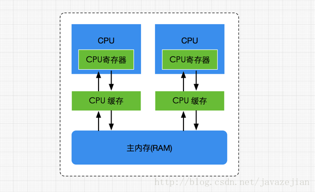 正如上图所示,经过简化CPU与内存操作的简易图,实际上没有这么简单,这里为了理解方便,我们省去了南北桥并将三级缓存统一为CPU缓存(有些CPU只有二级缓存,有些CPU有三级缓存)。就目前计算机而言,一般拥有多个CPU并且每个CPU可能存在多个核心,多核是指在一枚处理器(CPU)中集成两个或多个完整的计算引擎(内核),这样就可以支持多任务并行执行,从多线程的调度来说,每个线程都会映射到各个CPU核心中并行运行。在CPU内部有一组CPU寄存器,寄存器是cpu直接访问和处理的数据,是一个临时放数据的空间。一般CPU都会从内存取数据到寄存器,然后进行处理,但由于内存的处理速度远远低于CPU,导致CPU在处理指令时往往花费很多时间在等待内存做准备工作,于是在寄存器和主内存间添加了CPU缓存,CPU缓存比较小,但访问速度比主内存快得多,如果CPU总是操作主内存中的同一址地的数据,很容易影响CPU执行速度,此时CPU缓存就可以把从内存提取的数据暂时保存起来,如果寄存器要取内存中同一位置的数据,直接从缓存中提取,无需直接从主内存取。需要注意的是,寄存器并不每次数据都可以从缓存中取得数据,万一不是同一个内存地址中的数据,那寄存器还必须直接绕过缓存从内存中取数据。所以并不每次都得到缓存中取数据,这种现象有个专业的名称叫做缓存的命中率,从缓存中取就命中,不从缓存中取从内存中取,就没命中,可见缓存命中率的高低也会影响CPU执行性能,这就是CPU、缓存以及主内存间的简要交互过程,总而言之当一个CPU需要访问主存时,会先读取一部分主存数据到CPU缓存(当然如果CPU缓存中存在需要的数据就会直接从缓存获取),进而在读取CPU缓存到寄存器,当CPU需要写数据到主存时,同样会先刷新寄存器中的数据到CPU缓存,然后再把数据刷新到主内存中。