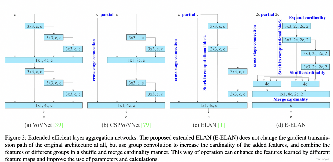 通过控制最短最长的梯度路径,更深的网络可以有效地学习和收敛。作者提出ELAN结构。基于ELAN设计的E-ELAN 用expand、shuffle、merge cardinality来实现在不破坏原有梯度路径的情况下不断增强网络学习能力的能力。(PS:该版本模型以及E6E网友反馈均未实现E-ELAN),论文中相关的图如下,其中的cross stage connection 其实就是1*1卷积: