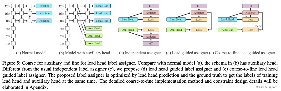 一些细节:其loss函数和不带辅助头相同,加权系数不能过大(aux head loss 和lead head loss 按照0.25:1的比例),否则会导致lead head出来的结果精度变低。匹配策略和上面的不带辅助头(只有lead head)只有很少不同,其中辅助头: