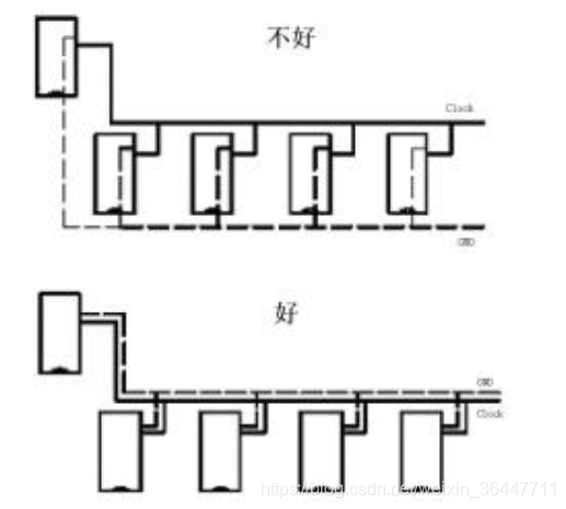 - 时钟信号引线最容易产生电磁辐射干扰,走线时应尽量短并与地线回路靠近。