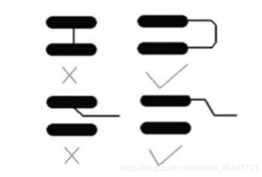 - 如果贴片 IC相邻两个焊盘为同一网络需接到一起时,两焊盘不可直接在贴片IC下相连。
