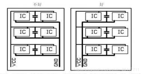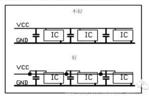 每10个集成电路要加一片充放电电容,引线式电容用于低频,贴片式电容用于高频,每个集成芯片要布置一个0.1UF的电容 llegro设计对抗噪声能力弱、关断时电源变化大的器件要加高频去耦电容,电容之间不要共用过孔去耦电容引线不能太长