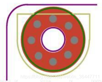 - 对于PCB上的地线需与金属外壳相连时,可在螺丝定位孔位加上助焊层以露出铜皮并加过孔,以便通过金属螺丝与外壳良好接触。如下图,灰色为过孔,桔红色为TopSolder及BottomSolder层;绿色及黄色为丝印。