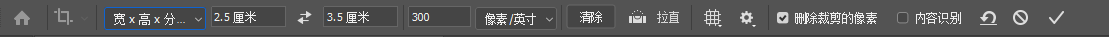 ,然后在主菜单栏下面的裁剪工具栏中设置待裁剪参数。选择“宽*高*分辨率”,我们以制作一个一寸照片为例,通过查表我们知道,宽高分别设置为2.5cm、3.5cm,分辨率设置为300,之后对照片合适部分进行裁剪。工具栏如图2所示。