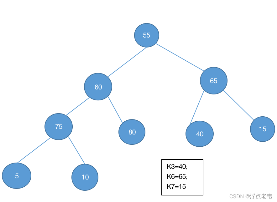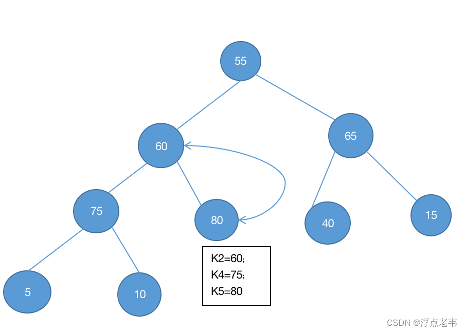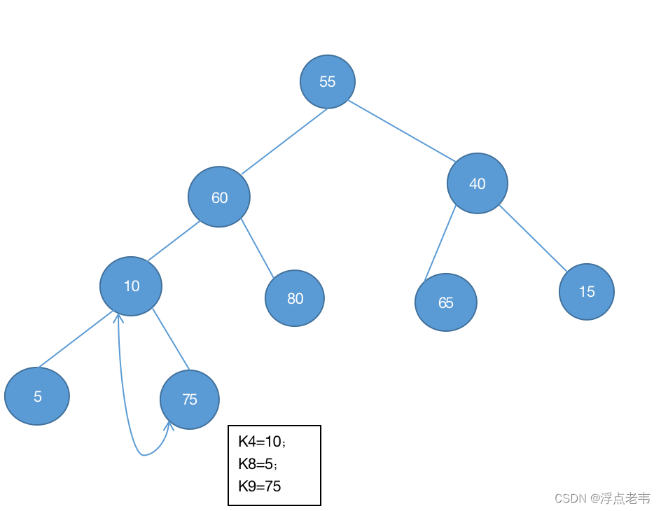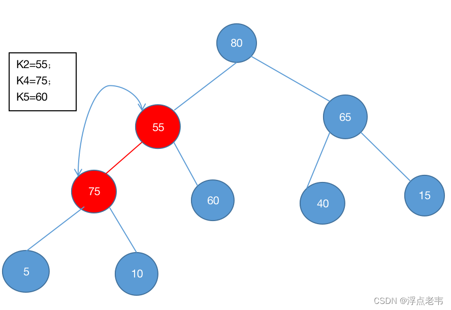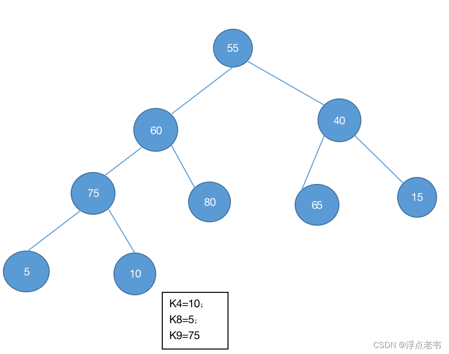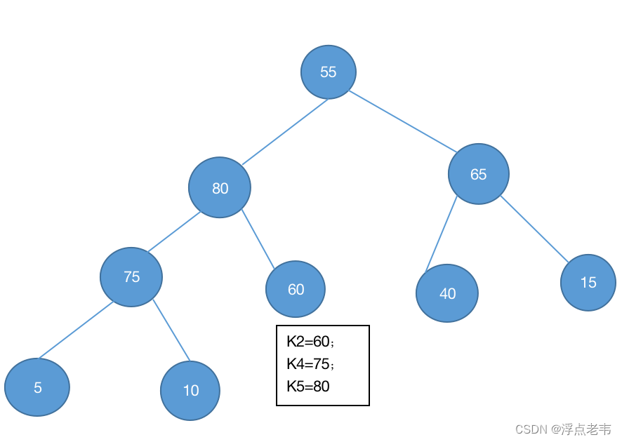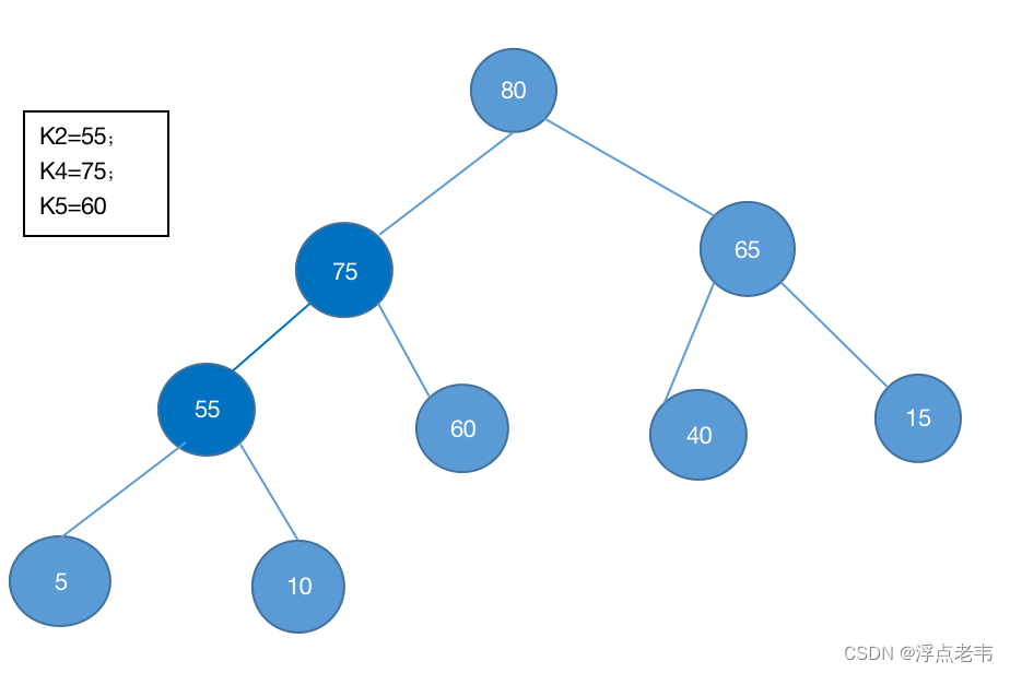 此时,K2、K4、K5不满足堆定义,需要调整,最后得到以75为根结点的大根堆: