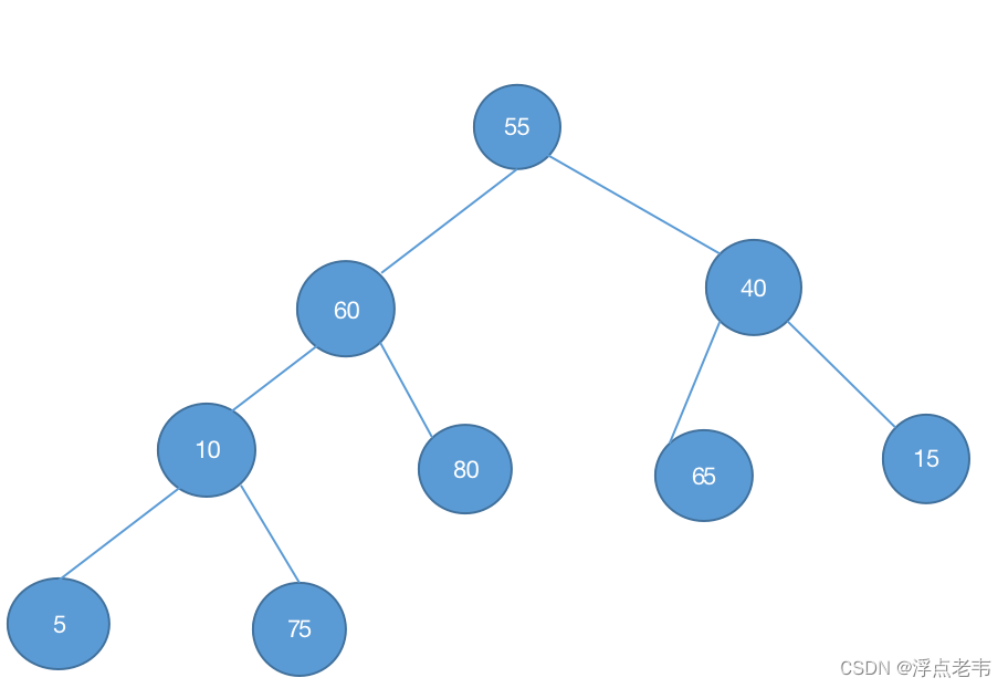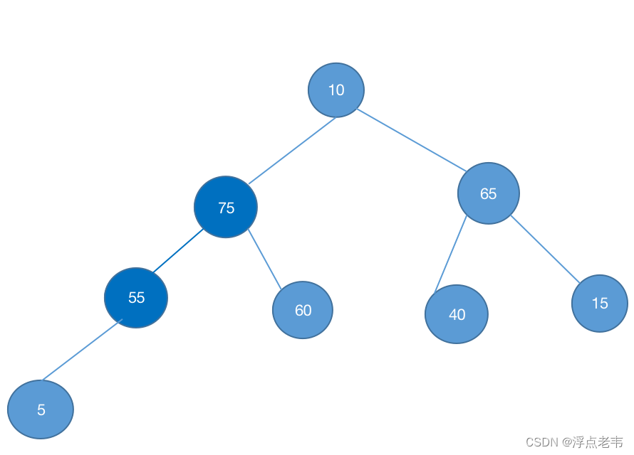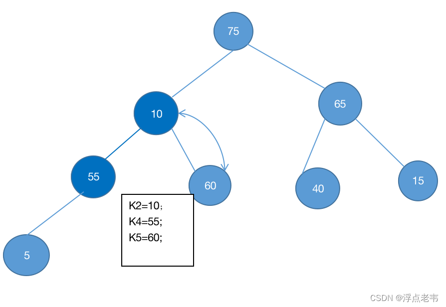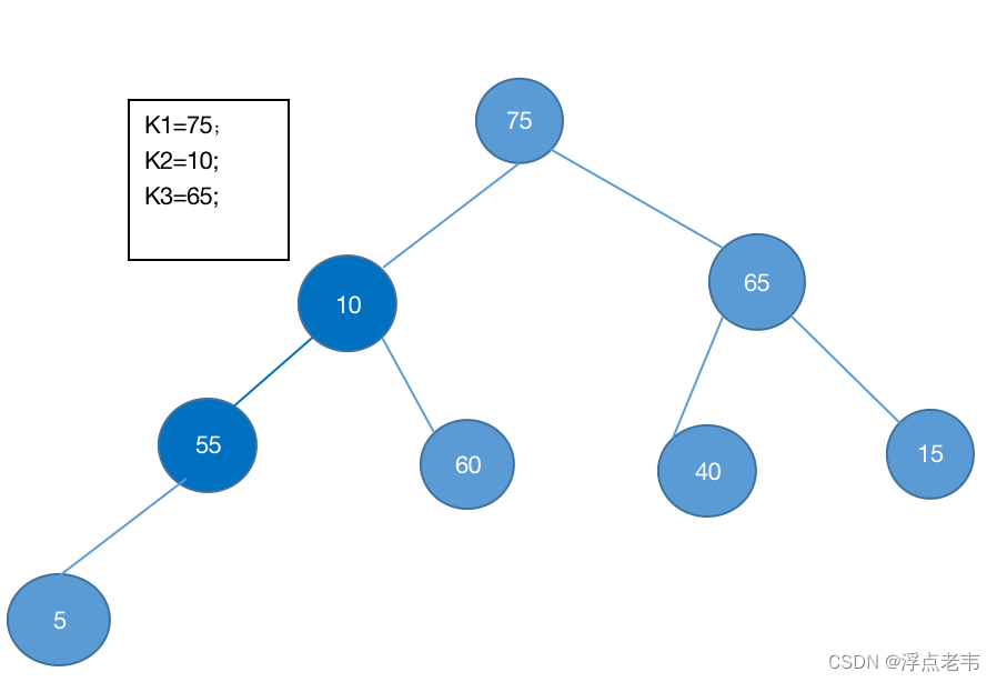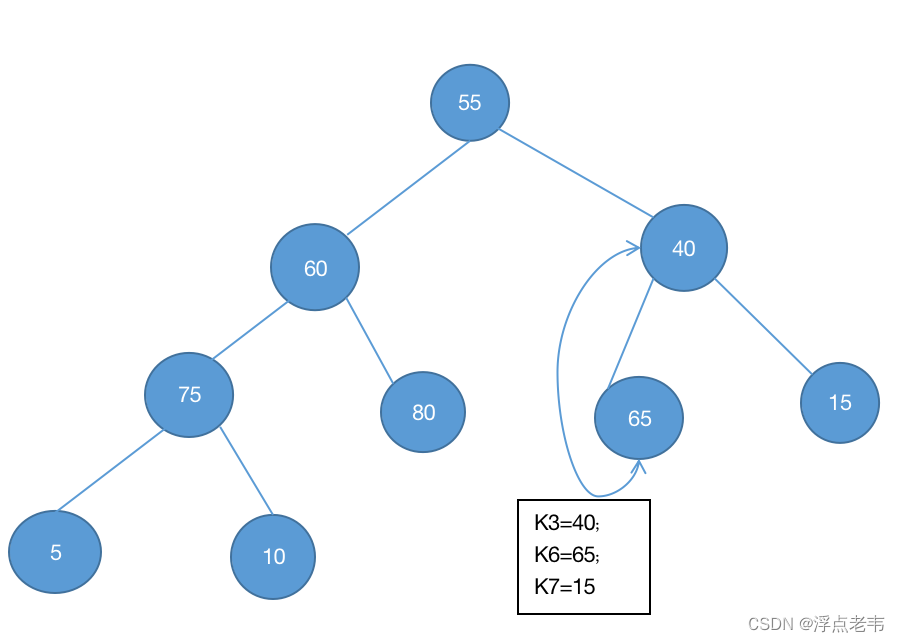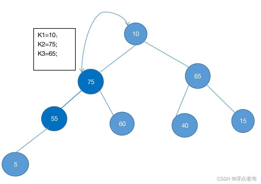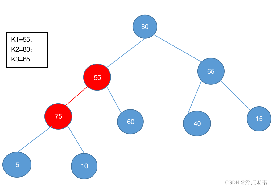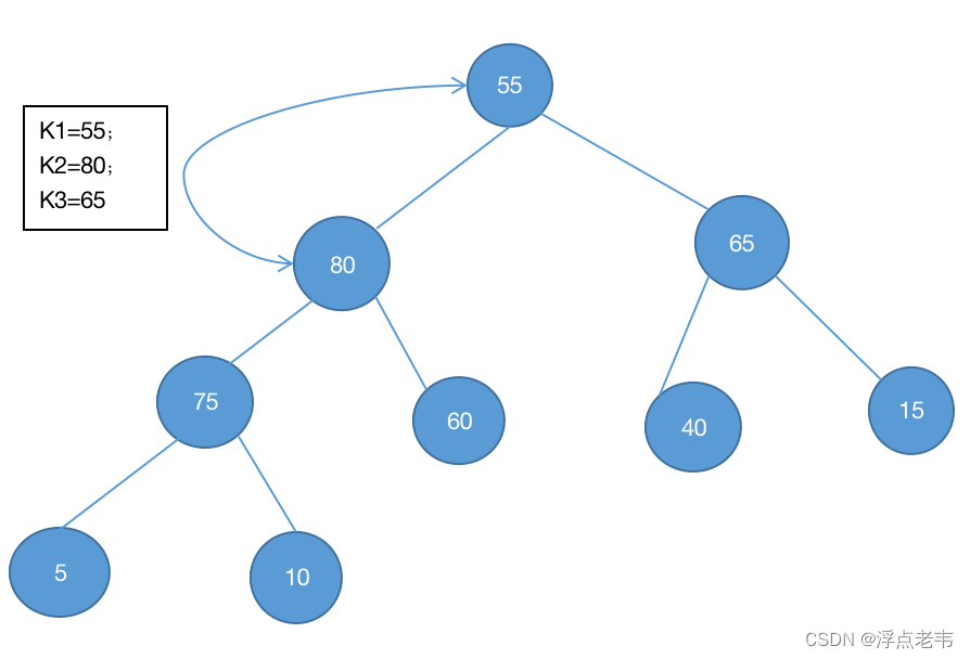 此时,K2、K4、K5不满足堆定义,需要调整,最后得到以75为根结点的大根堆: