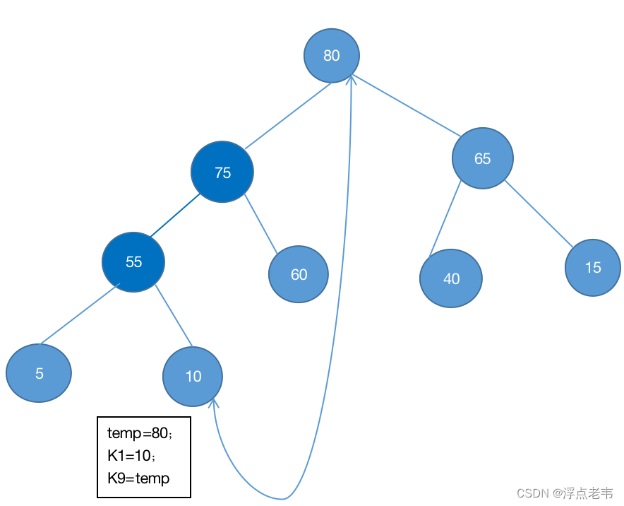 这样,初始堆就构建完成了,堆顶80即为序列中最大值。