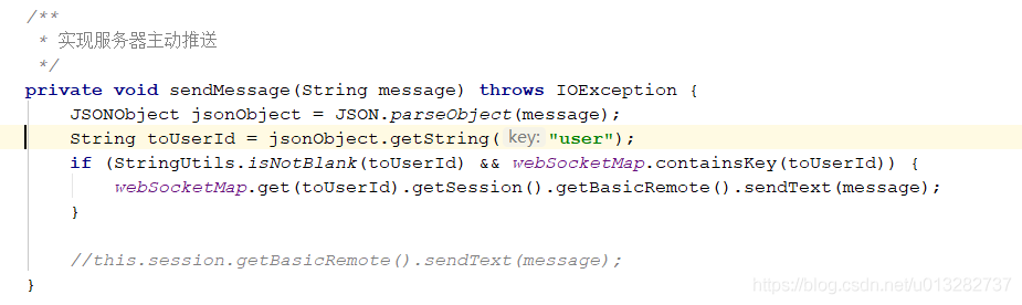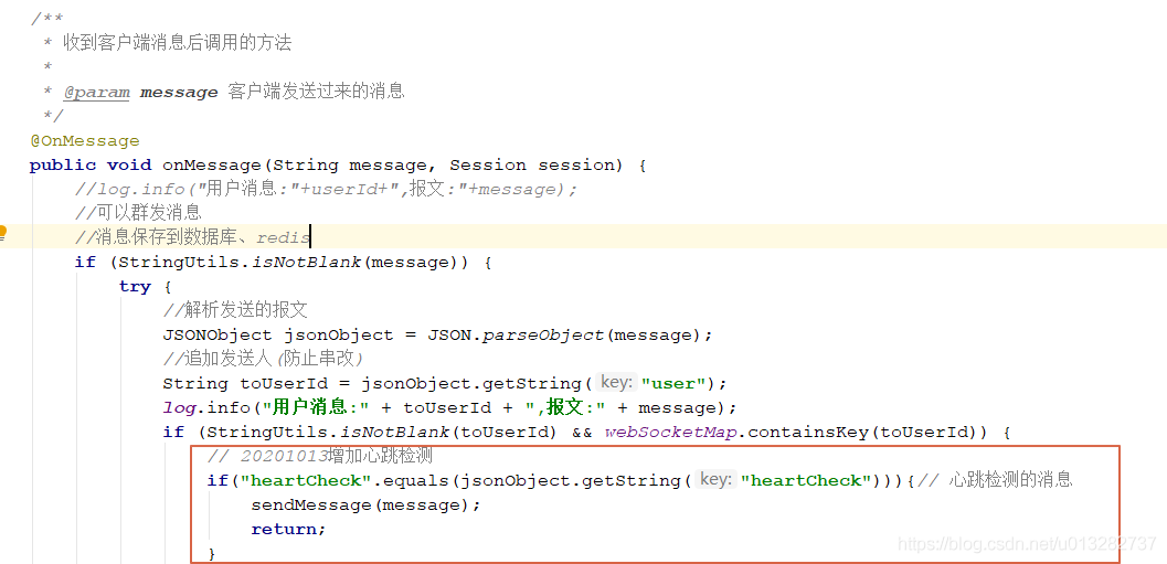 if("heartCheck".equals(jsonObject.getString("heartCheck"))){// 心跳检测的消息