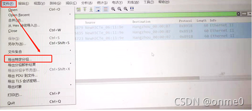 第3步:点击“文件”——>“导出特定分组”——>选择导出的数据包(Selected packet或者Marked packets)