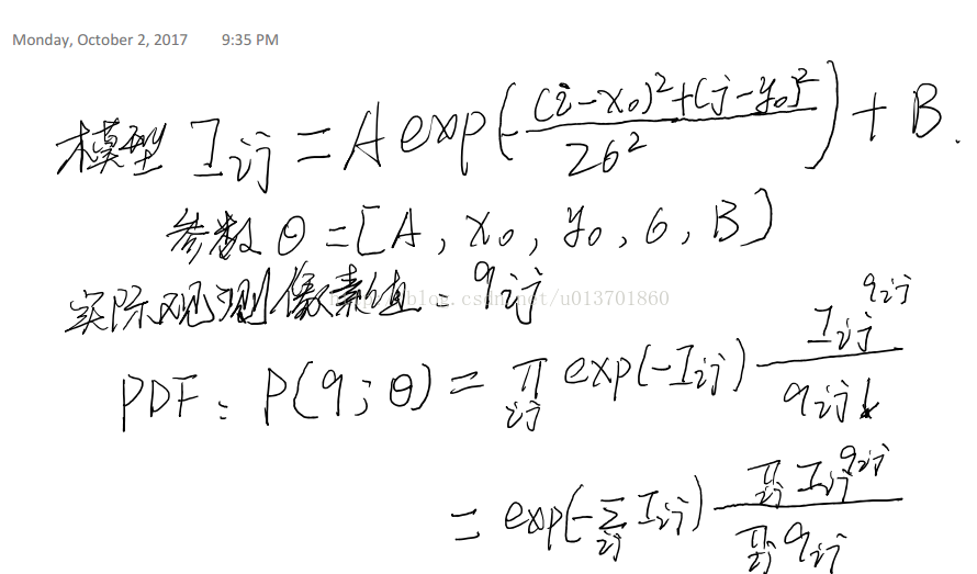 总共有5个参数:A(峰值强度),x0, y0 (高斯函数横向和纵向的位置),σ(PSF宽度),B(背景强度)。