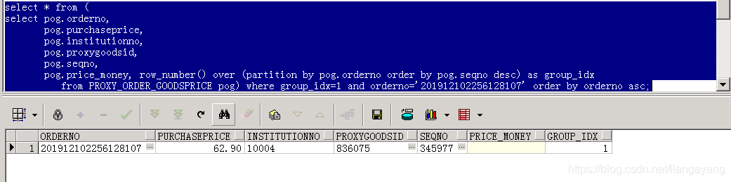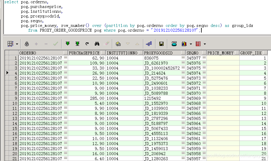 select * from ( select pog.orderno, pog.purchaseprice, pog.institutionno, pog.proxygoodsid, pog.seqno, pog.price_money, row_number() over (partition by pog.orderno order by pog.seqno desc) as group_idx from PROXY_ORDER_GOODSPRICE pog) where group_idx=1 order by orderno asc