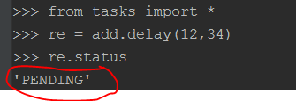 >>> app.config_from_object('celeryconfig')在python终端导入celery模块声明实例然后加载配置文件,完成了这些步骤后就可以动态的发送任务并且查看任务状态了。注意在配置文件celeryconfig.py中我们已经开启了处理的结果回应模式了CELERY_IGNORE_RESULT = False并且在回应方式配置中我们设置了CELERY_RESULT_BACKEND = 'amqp'这样我们就可以查看到处理的状态了。