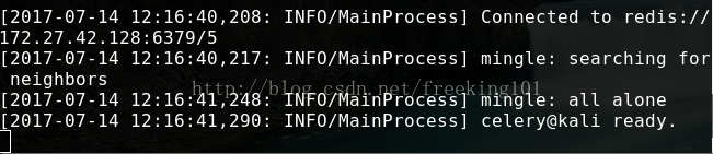 $ celery -A tasks worker --loglevel=info发现前一个服务器的Celery服务中输出你刚启动的服务器的hostname,前提是那台服务器连上了你的rabbitmq。然后再进入python交互模式: