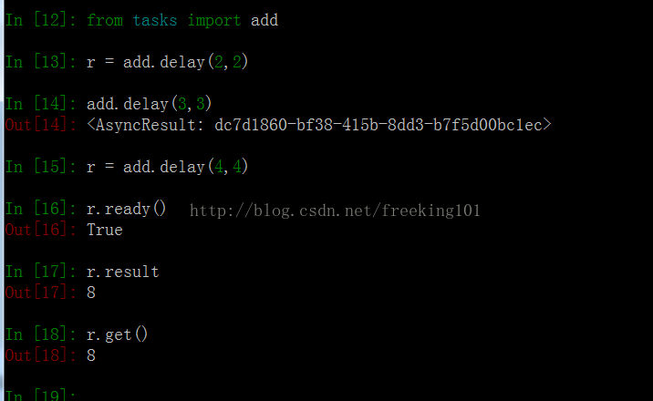 >>> add.delay(4, 4)到此为止,你已经可以使用celery执行任务了,上面的python交互模式下简单的调用了add任务,并传递 4,4 参数。