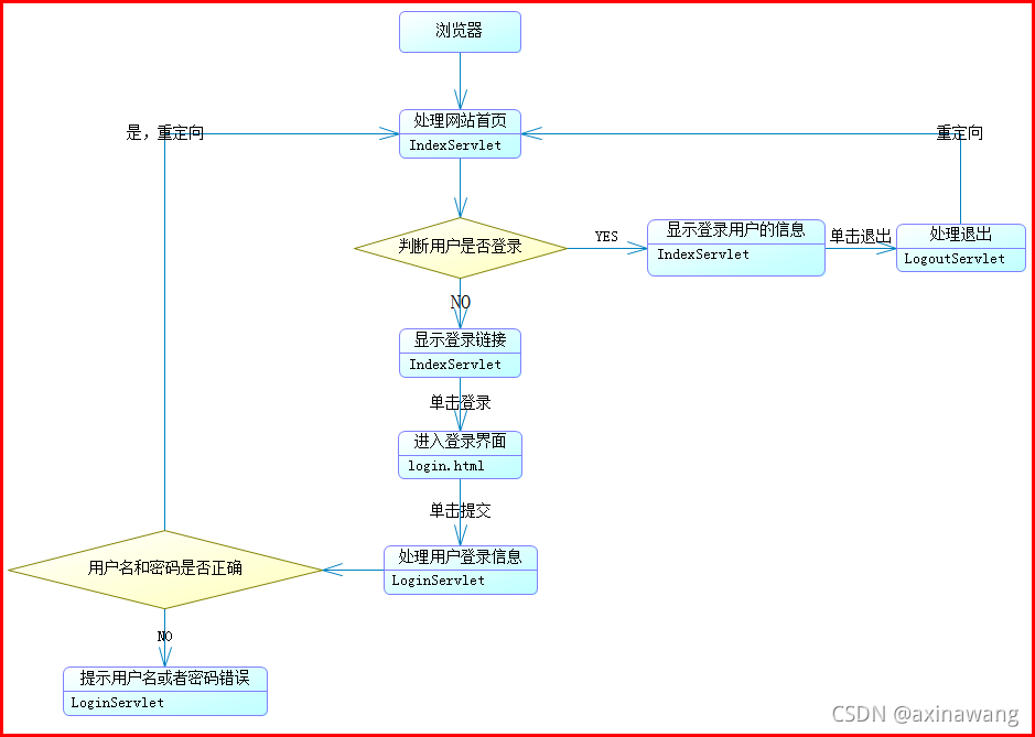 }当用户单击退出时,该类会将Session对象中的user属性移除,之后跳转到首页