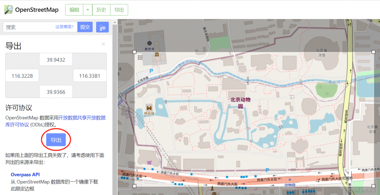 Overpass API是OSM数据库的一个镜像,当研究区域较大导致前述“Export”方法不能下载时,可以用这一方法进行下载。