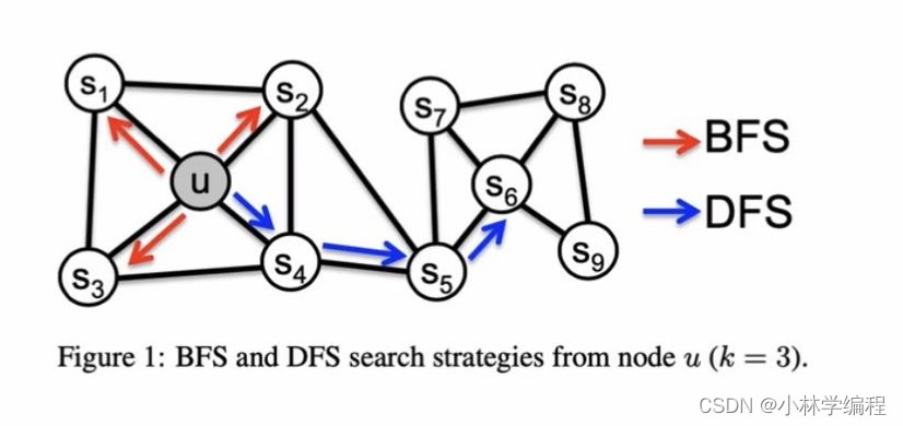 如果说deepwalk是一种随机游走的话,node2vec则是有策略的随机游走,如下图: