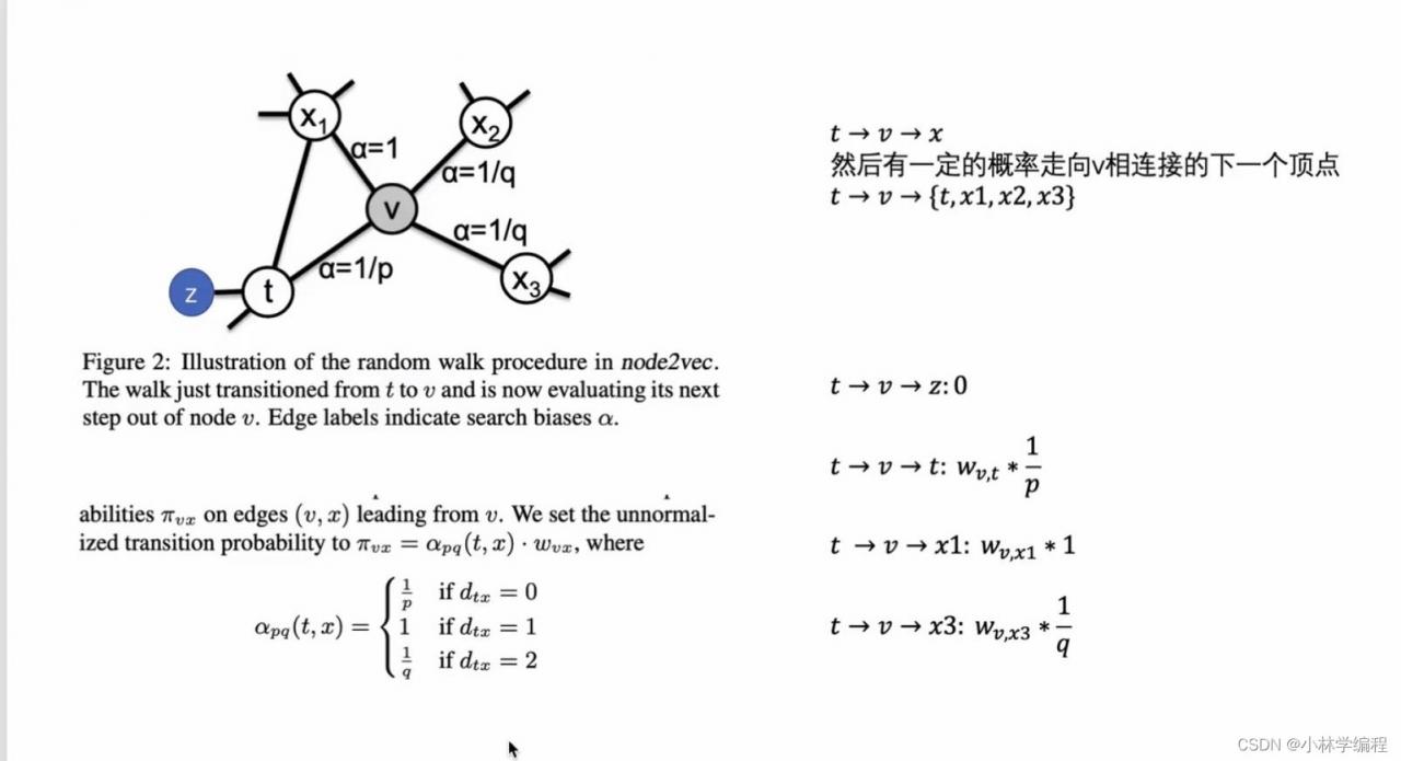 当t节点游走到v节点之后,之后v节点游走到下个节点就有点不再是随机的,到每个节点是有一定概率的,而这种概率在图中左下角的'π_vx'表示:
