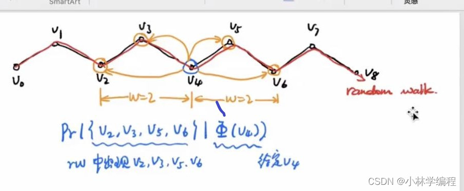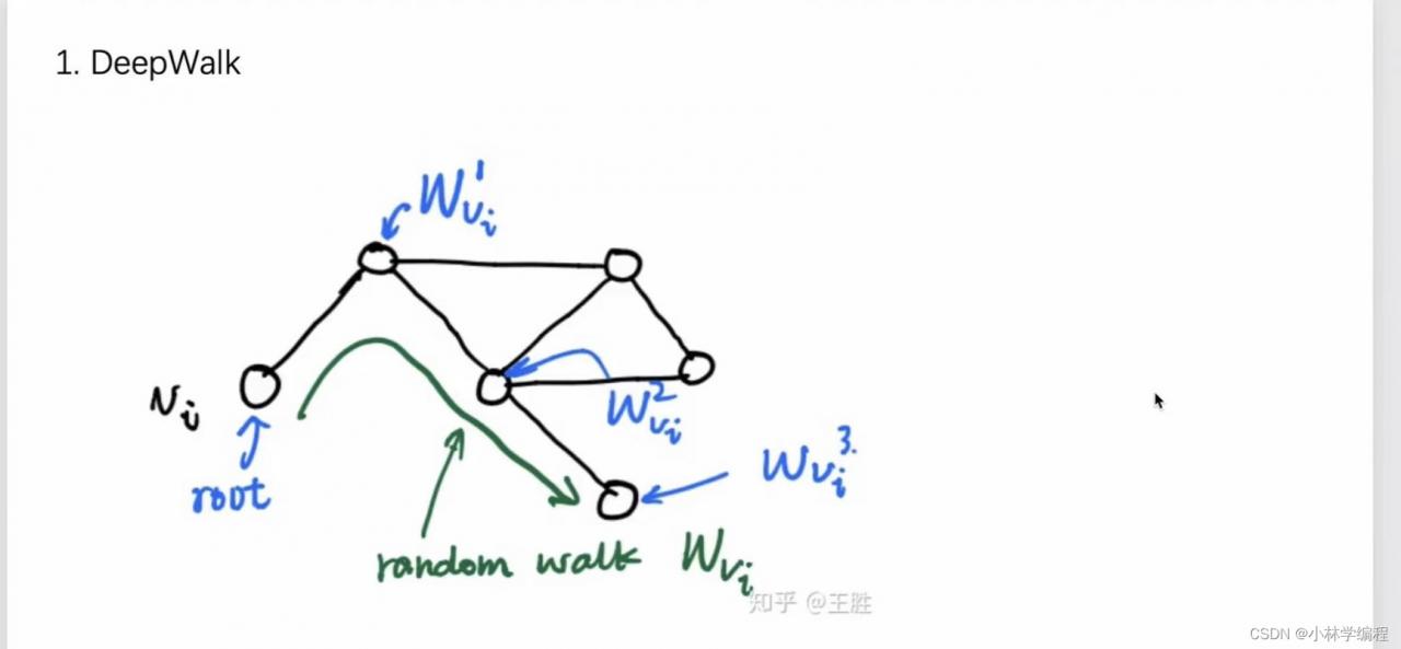ps:上述的deepwalk的流程只是其中的一次循环,真正的过程是这样的:先是在随机游走中选一个节点(随机游走图中的每个节点都需要被选中,比如w1,w2节点也需要作为‘root’节点)跑n次,每次得到的节点序列都要经历word2vec进行编译。(简单来说就是进行了一个双重循环)