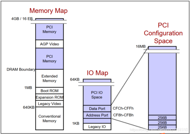 x86的处理器可以直接访问CPU Memory空间和I/O空间。PCI的Memory/IO 空间可以映射到CPU的Memory/IO空间以供CPU读写。特别要注意的是:PCI Memory地址空间支持32bit/64bit寻址;在PCI I/O地址空间中,PCI支持32bit地址,但是x86只用了16bit访问I/O空间,所以很多平台的I/O空间大小限制在64KB。