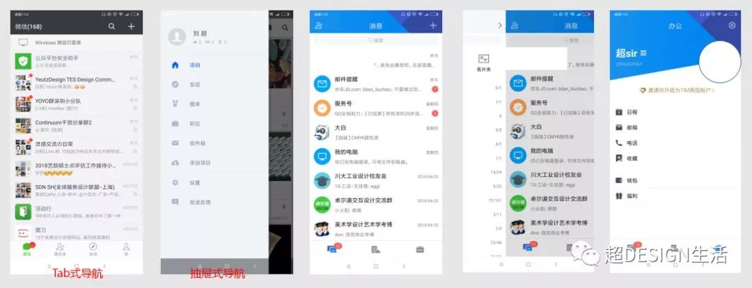 在移动端,一级导航的样式分辨为Tab式导航与抽屉式导航,Tab式导航虽然中规中矩,但是容易让用户理解并且记住,抽屉式导航给人的感觉会很酷,但是对信息是一种隐藏,如果第一重要级不是很突出,最好不要使用抽屉式导航,正如behance找图看图的第一重要级相较于其它就非常突出,打车软件与地图软件的地图首页的重要级就非常突出,在这样的情况下就可以使用抽屉式导航。所以为什么说TIM的信息架构非常的差,第一,一个社交软件,没有特别突出的重要级,竟然使用类始于抽屉式导航的形式将相对于比较重要的联系人页面进行了隐藏,相对于不太重要的办公页面去放置在主导航中。