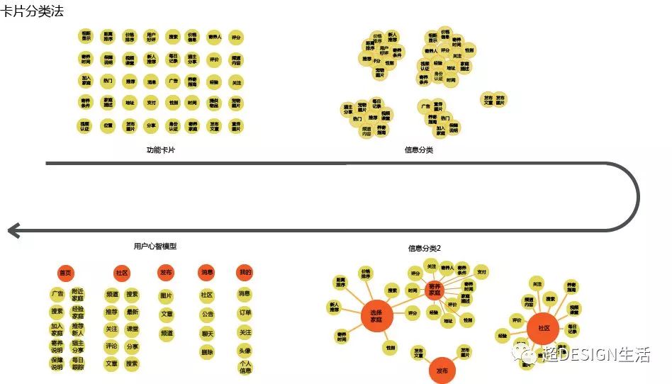 卡片分类法的流程:a 介绍卡片——b 用户归类卡片——c 让用户取名——d继续归类——e 简单的访谈——f 拍照存档