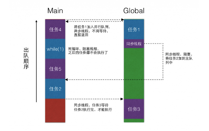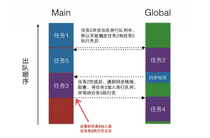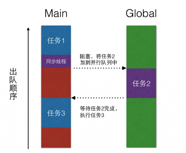 首先执行任务1,接下来会遇到一个同步线程,程序会进入等待。等待任务2执行完成以后,才能继续执行任务3。从dispatch_get_global_queue可以看出,任务2被加入到了全局的并行队列中,当并行队列执行完任务2以后,返回到主队列,继续执行任务3。