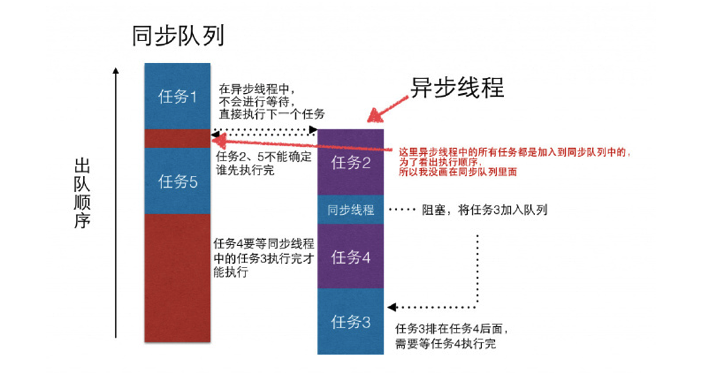 2.遇到异步线程,将【任务2、同步线程、任务4】加入串行队列中。因为是异步线程,所以在主线程中的任务5不必等待异步线程中的所有任务完成;