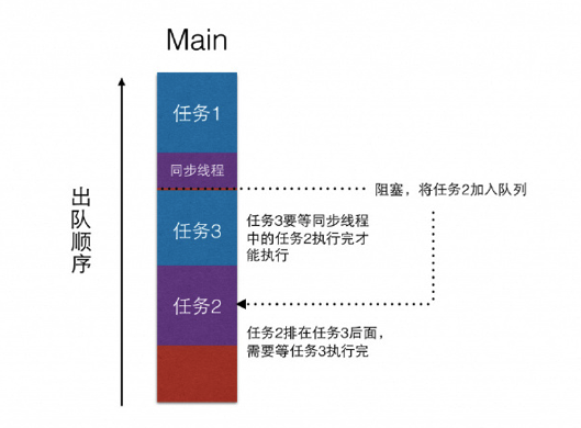首先执行任务1,这是肯定没问题的,只是接下来,程序遇到了同步线程,那么它会进入等待,等待任务2执行完,然后执行任务3。但这是主队列,是一个特殊的串行队列,有任务来,当然会将任务加到队尾,然后遵循FIFO原则执行任务。那么,现在任务2就会被加到最后,任务3排在了任务2前面,问题来了: