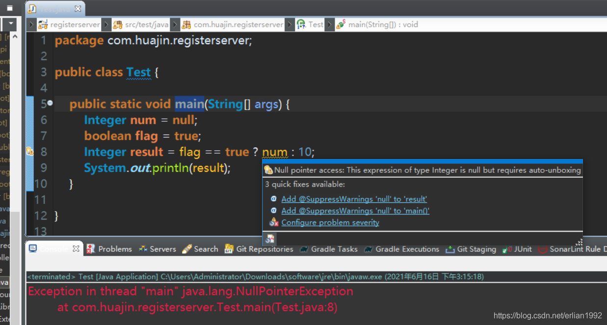 此时可以看到编译器给出的警告提示,num处会发生拆箱操作,执行程序发生空指针异常,因为三元表达式在条件为false时执行到num处进行拆箱操作,也就是Integer的intValue()方法。
