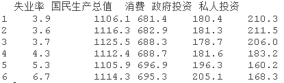 我们将使用经济序列数据。数据是一个五个季度的经济序列,包含以下数字变量:季度失业率、国民生产总值、消费、政府投资和私人投资。有161个观测点。