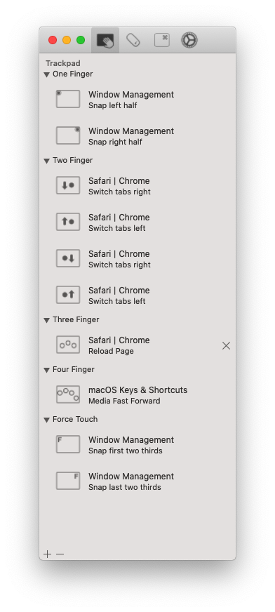 我设置了重按触控板左上角(触控板的按下分两个阶段,第二阶段是重按)将应用设置为当前桌面的左边 2/3,类似于 Magnet[18] 的左 2/3 功能,同样右上角重按设置为右 2/3,这两个是我最常用的功能。左上角轻按设置为左 1/2,右上角轻按设置为右 1/2。