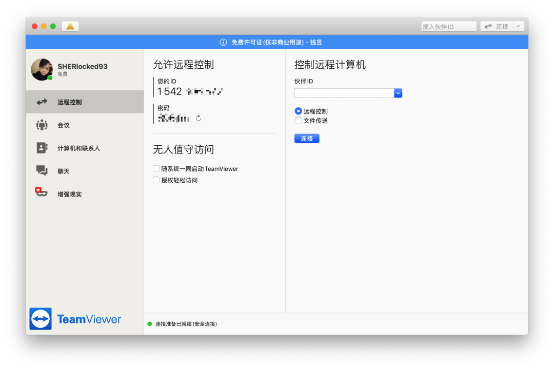因为控制电脑比较敏感,所以第一次在新设备上登录的时候需要验证邮箱。每次电脑重启后 TeamViewer 都会重新分配一个 ID 和密码,那如果是给客户远程服务,客户又不在电脑面前岂不是麻烦?TeamViewer 可以设置菜单栏的 连接->设置无人值守 后 ID 和密码就不再改变了,可以给办公室的电脑设置一个,这样在家也可以改 Bug 了,岂不是很方便!????
