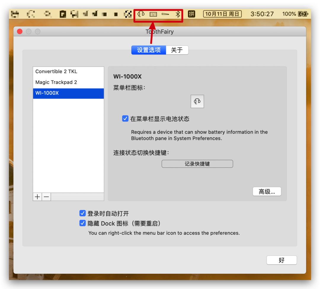 Tooth Fairly 它可以记住你的所有蓝牙设备,然后通过设置好的快捷键一键切换连接或断开的状态,不用在蓝牙菜单里面找了,真正做到了多设备无缝切换(但也相应占用宝贵的菜单栏位置,不过可以用第二篇文章的 Dozer[8] 来做隐藏),还可以给蓝牙设备的切换设置快捷键,很炫酷了。