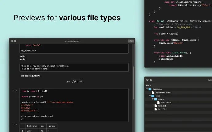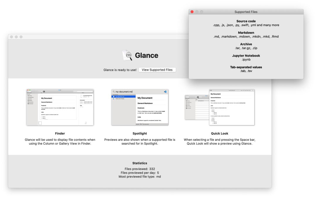 Mac 的空格键文件预览功能 QuickLook 相信是很多刚从 Win 换到 Mac 的人最惊艳的功能,但支持的格式并不是很多。Glance 是开源免费的 Mac 应用(但是 Github 上的仓库现在是 Archived 状态,可能是作者想拿去变现?),可用于预览多种原来 QuickLook 不被支持的文件格式,特别是 Markdown 和代码文件的临时预览,是我最常用的功能,比较骚的是还能预览未解压缩的压缩包里的内容。