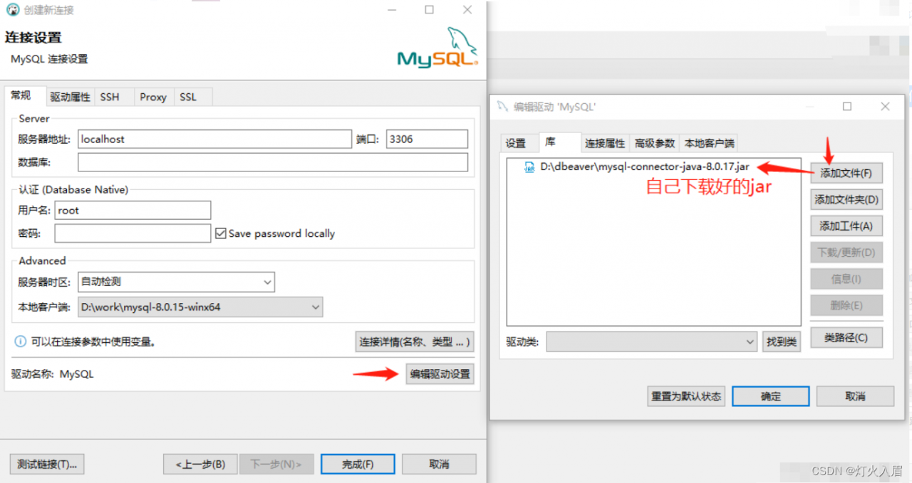 使用本地驱动,需下载好相应的驱动jar包 ,打开DBeaver在“编辑驱动”里,能够看到相应的驱动信息,在“库”里,能够添加jar文件,添加完成后,要把之前的驱动信息删除,否则会默认使用之前的