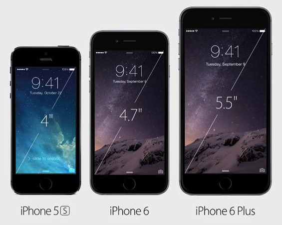 指的是显示屏的对角长度,以下为iPhone5s、iPhone6s、iPhone6Plus屏幕尺寸规格示意图: