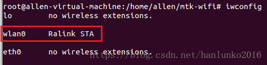 用iwconfig查看virture interface是否生成, 如果出现wlan0 ,说明wifi dongle已经起作用, 但还没有up起来