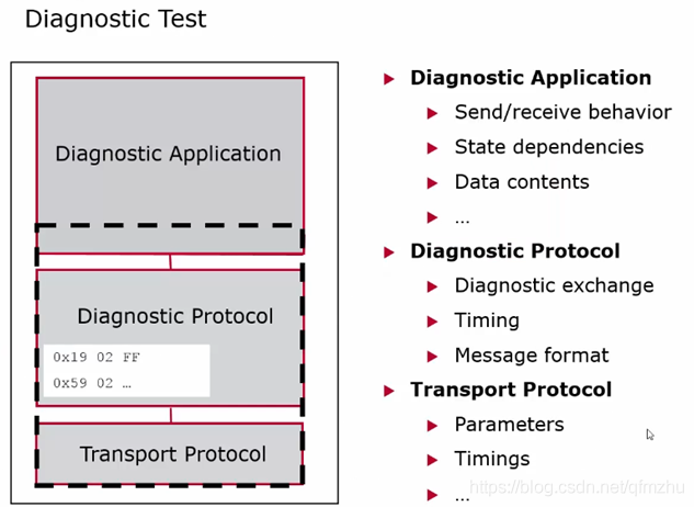 诊断功能实现后,当然也需要进行测试验证,诊断测试通常有几个部分的测试:诊断协议的测试,例如报文格式的测试;传输层的测试,例如传输层相关时间参数的测试;第3个就是诊断应用的测试,例如会话安全集转换的一个测试;DID具体数值的测试等等。