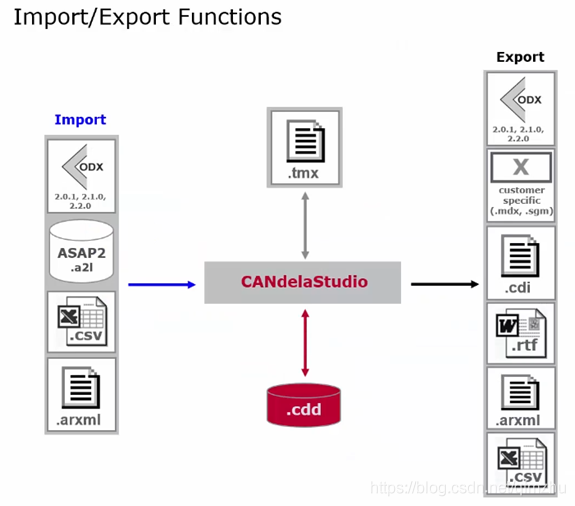 CANdelaStudio除了可以去建立CDD文件以外,也可以支持多种文件的一个导入和导出,在这里呢,大家可能比较关心的一个是CDD可以导出ODX文件,另外呢就是CDD可以导出ARXML文件,那CDD可以导出的是国际标准的ODX 2.0.1,2.1.0和2.2.0。