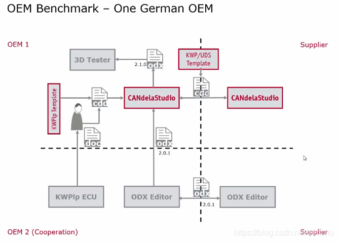 另外一个使用案例呢,是欧洲的两个主机厂之间有一个合作的项目,那么这个时候呢,在合作以前,OEM1它使用的CDD文件,而OEM2它使用的ODX文件,那么这个时候,它们两之间相互交互的时候呢?OEM1就选择用CDD导出相应的ODX文件,来跟OEM2之间来进行交互,以及相应的一些工作,那ODX本身这个文件也可以用在不同公司不同的部门之间相互的一个交互,而我们原本的CDD文件,也可以用在我们一开始的开发流程当中,不用改变它自身已有的相关的一些流程。