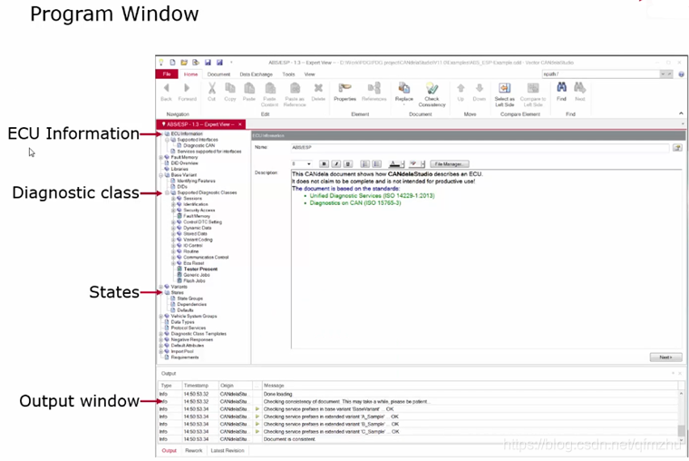 诊断数据库里面有3大部分的内容:ECU Information通信参数的部分;Diagnostic class诊断服务的部分;States定义的就是我们会话安全集的部分。