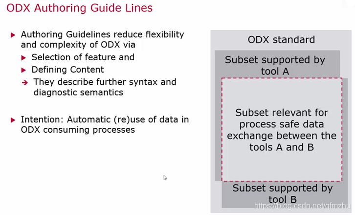 在描述一个ODX文件的时候,我们需要注意的是,ODX标准本身它定义的很宽泛,你可以把它想象成它是描述了一个100%的内容,而每一个工具,不同家的工具在实现ODX的时候,它可能都会满足其中的可能70~80%这样一个需求,就会造成工具A和工具B之间能够相互兼容其实只有每个中间的一部分并不能够相互兼容彼此的100%,那这个时候当然我们主机厂在使用ODX这个文件的时候,肯定是希望我所有的工具供应商都能满足我释放的同一份ODX文件,所以这个时候需要定义企业级的ODX规范,也就是ODX Guide line,也就是ODX实现指南,来定义好我这家企业所需要的ODX文件是什么样的,然后来让我不同的工具供应商来基于这份企业级规范满足不同一个ODX需求。